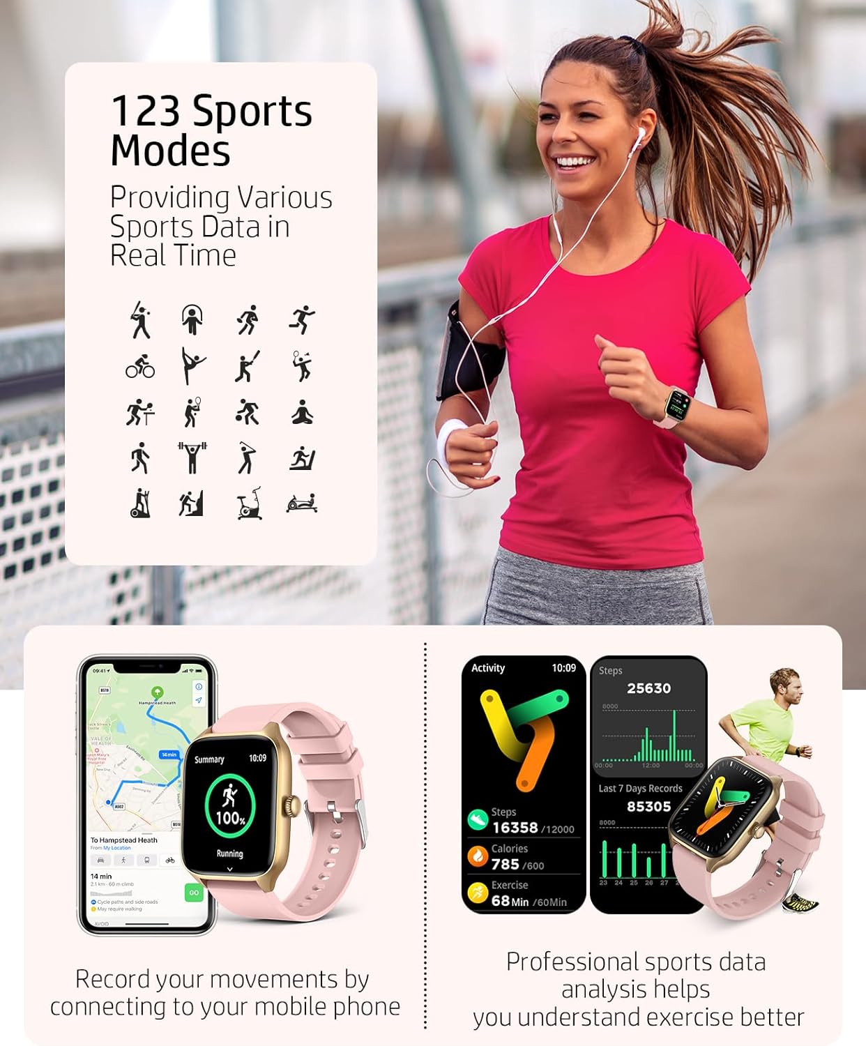 - COMPREHENSIVE HEALTH AND FITNESS COMPANION —— Elevate your well-being with a holistic health and fitness partner. With 123 professional sports modes, heart rate monitoring, blood pressure monitoring, blood oxygen monitoring, and detailed exercise tracking, it’s not just a watch; it’s a comprehensive health dashboard. The features extend to accurate sleep monitoring, stress management, and menstrual cycle prediction, offering a 360-degree approach to your well-being.